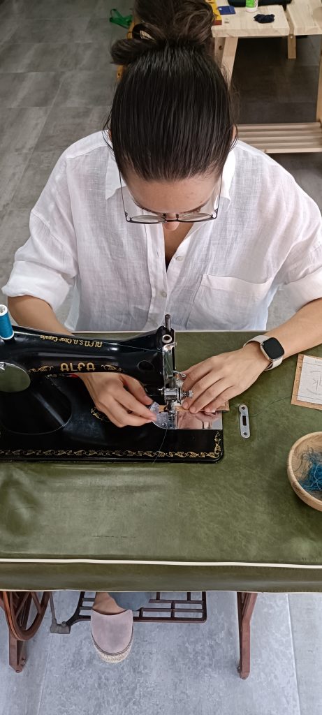 Después pensamos en los materiales que podíamos aplicar. Buscamos tecnologías opuestas, una más industrializada (corte y grabado láser), con una más artesanal (máquina antigua Alfa). Esta máquina tiene además un valor sentimental porque es la máquina que la abuela usó durante toda la vida.
