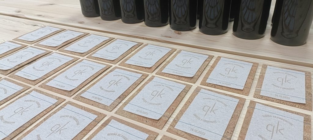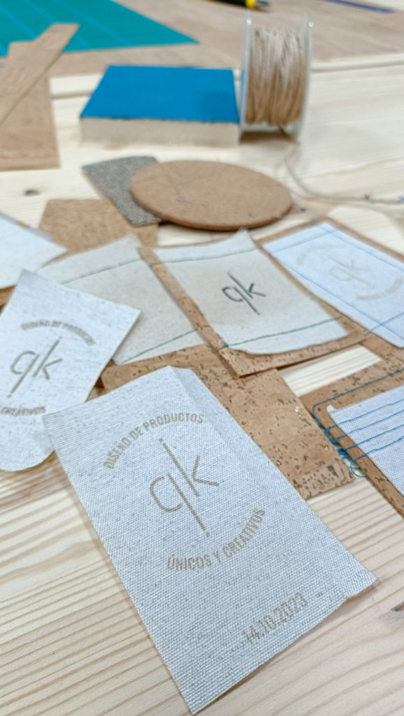 También en el grabado y corte láser hubieron cambios. Nos costó encontrar la potencia y velocidad adecuada, para que el tejido no se quemara. Y el tejido al tener una trama natural, el grabado no se apreciaba bien. Así que tuvimos que agrandar un poco la etiqueta diseñada para que el texto fuera legible.
